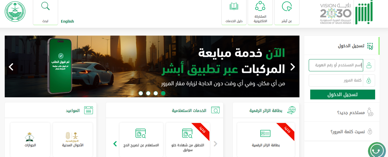 الذهاب إلى الموقع الرسمي لمنصة أبشر الإلكترونية عبر الرابط.