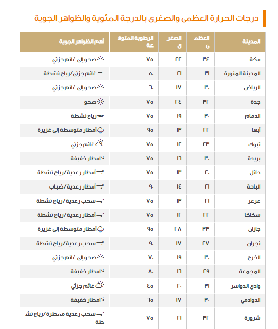 وجميع المناطق السابق ذكرها استقبلت التحذير العام والشامل من الرياح النشطة بسرعة تزيد عن 60 كم/ ساعة لتكون مُسببة لإثارة الأتربة والغبار، وآخر ما أشارت إليه الأرصاد السعودية هنا هي درجات الحرارة على النحو التالي: