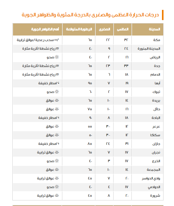إذ ورد عن الأرصاد أن الأمطار الرعدية التي تسبقها تكون سحب رعدية ممطرة وتصاحبها رياح نشطة بأكثر من 45 كم/ ساعة؛ هي ما يجب توخي الحذر منها بأكبر قدرٍ ممكن خاصةً في كلٍ من الحدود الشمالية، الرياض، تبوك، الباحة، عسير والمدينة المنورة.