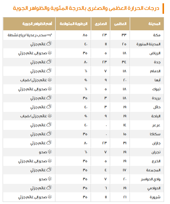 إذ تم التأكيد على أن الصقيع الذي بدأ يتكون منذ يومين لا يزال مستقرًا في تبوك بالأخص مرتفعاتها بالإضافة إلى المناطق الثلاث السابقة، وبشكلٍ عام تلك الموجة تتمثل في انخفاض كبير في درجات الحرارة بما يصل إلى 3 و5 درجة بل وهناك مناطق تم رصد درجات صفرية فيها؛ وهذا ما يتضح من الجدول الآتي: