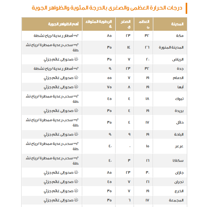 ومن ثم جاء في تفصيل بيان الأرصاد السعودية أن الضباب يحدّ من الرؤية الأفقية خاصةً وقت الصباح الباكر والليل المتأخر على كلٍ من المنطقة الشرقية، عسير والباحة، أما الأمطار فإن فرص هطولها بشدة خفيفة إلى متوسطة هي ما تشهدها كلٌ من الباحة، المدينة المنورة، الجوف، تبوك ومكة المكرمة.