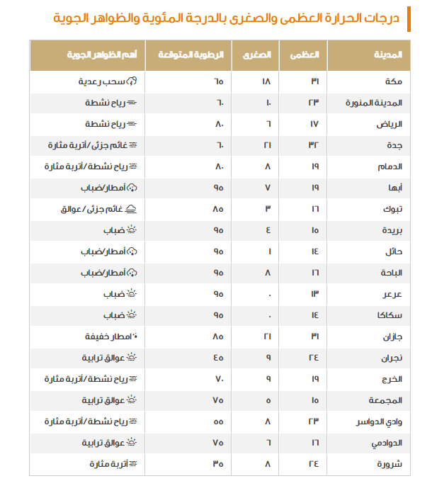 بينما جاء تحذير آخر من الضباب لتلك المناطق السابق ذكرها، في حين أن الأرصاد السعودية وجّهت تحذير شديد ومهم من الانخفاض الملحوظ في درجات الحرارة على مختلف المناطق مثل؛ الرياض، المدينة المنور، المنطقة الشرقية، الحدود الشمالية، الجوف، تبوك ونجران، حيث جاءت الدرجات المرصودة بمثل ما هي موضحة على النحو الآتي: