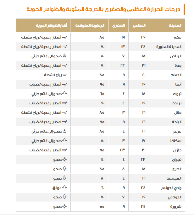في نفس البيان قامت الأرصاد السعودية بالتحذير من الحالة الضبابية التي تتكون على أجزاء متفرقة من المناطق المذكورة أعلاه بالإضافة إلى المنطقة الشرقية، بينما التحذير الأشد فجاء بخصوص برودة الأجواء بصورة ملحوظة خاصةً على المناطق الواقعة وسط وشمال المملكة وهذا ما يتم توضيحه من درجات الحرارة الآتية: