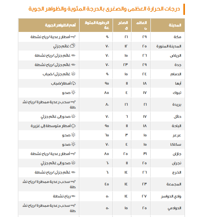 وأخيرًا تم عرض درجات الحرارة في السعودية التي تم رصدها اليوم السبت وهي ما تشير إلى أن الطقس مائل جدًا للبرودة، وذلك كما يلي: