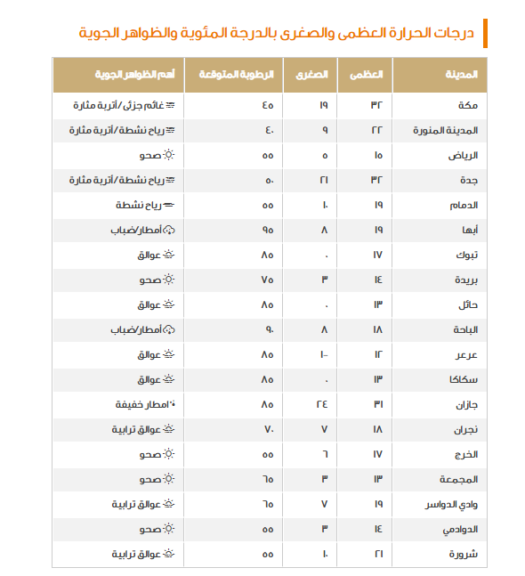 كذلك تمت المتابعة بأن الحالة الجوية داخل المملكة تميل إلى أن تكون مطرية بالأخص على كلٍ من الباحة، عسير وجازان ومكة المكرمة، وهذا ما صاحبه تنويه من شدة الرياح التي تهبّ على ذات المناطق بالإضافة إلى المنطقة الشرقية وتثير الغبار والأتربة.