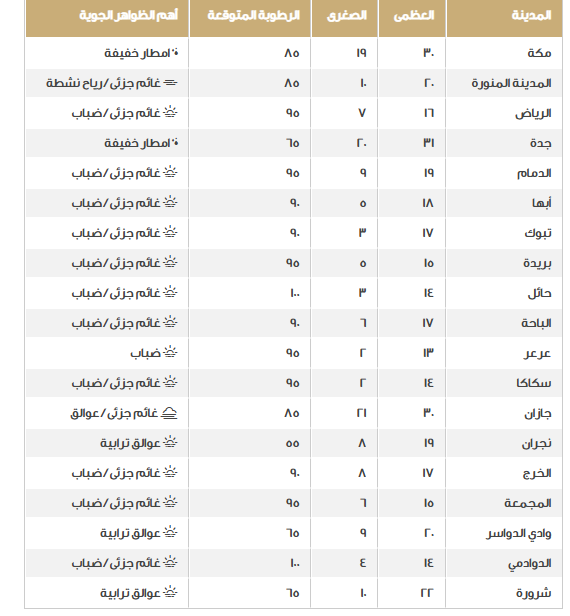 كذلك تمت المتابعة في هذا البيان بالتحذير من الضباب أو الشبورة المائية الكثيفة الذي يتكون على الباحة، عسير وجازان وهو ما يعمل على الحدّ من الرؤية على المستوى الأفقي، وأما ما يتعلق بدرجات الحرارة فهي لا تزال في حيز التراجع بمثل ما يلي:
